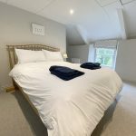 There are four bedrooms – the master with its gorgeous ensuite and huge bath tub, a further double bedroom interconnected with a large bunk bedroom, and a another double bedroom (that can also be made up as a twin), all serviced by a smart family bathroom with big walk in shower, and accessed via two staircases. The kitchen features a traditional Aga-style cooker, slate flooring and has a high vaulted ceiling with exposed A-frames.